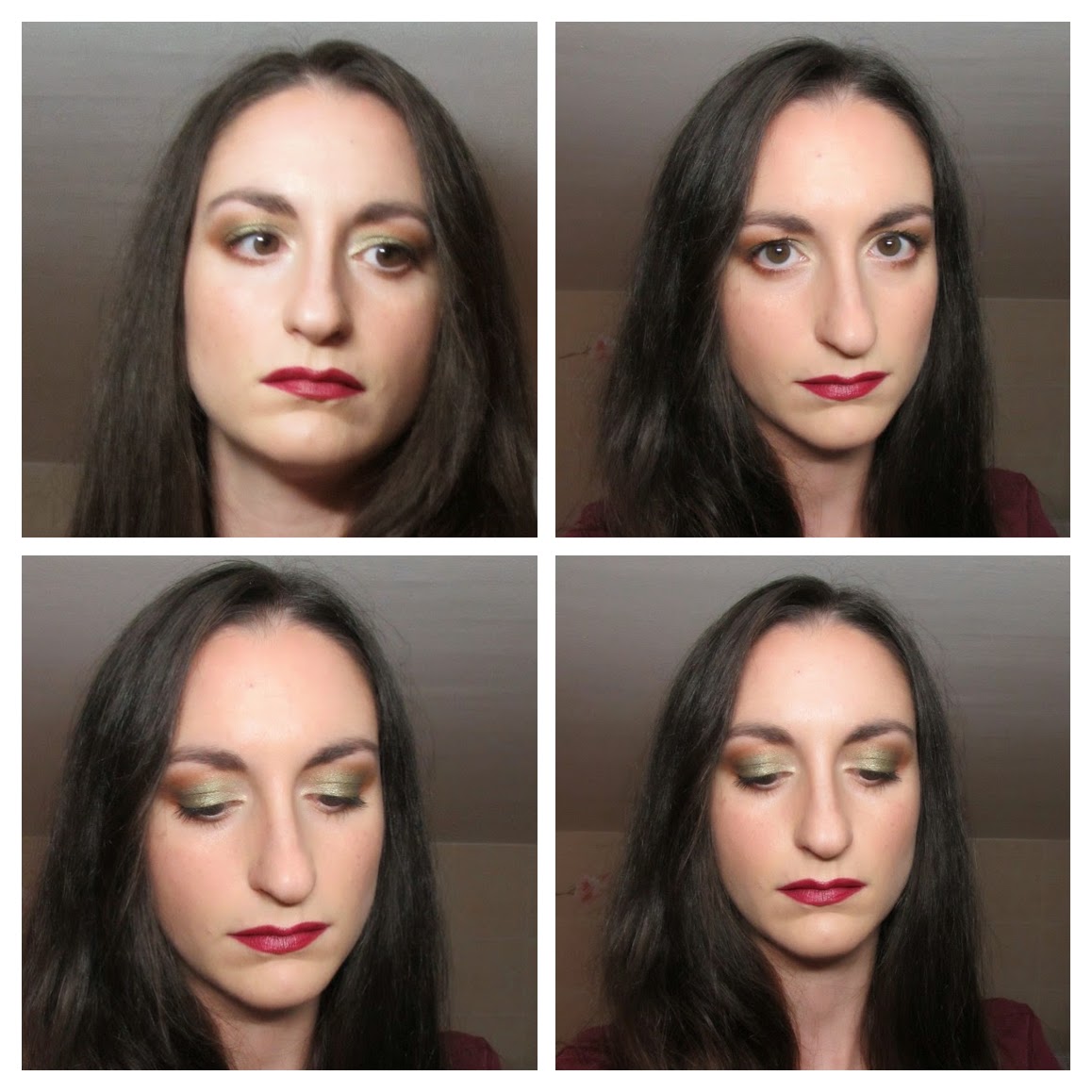 Per realizzare il look ho utilizzato il verde oliva al centro della palpebra mobile e il marrone ramato nella v esterna, nella piega e nella parte inferiore dell'occhio. Ho aggiunto un punto luce applicando l'oro nell'angolo interno.