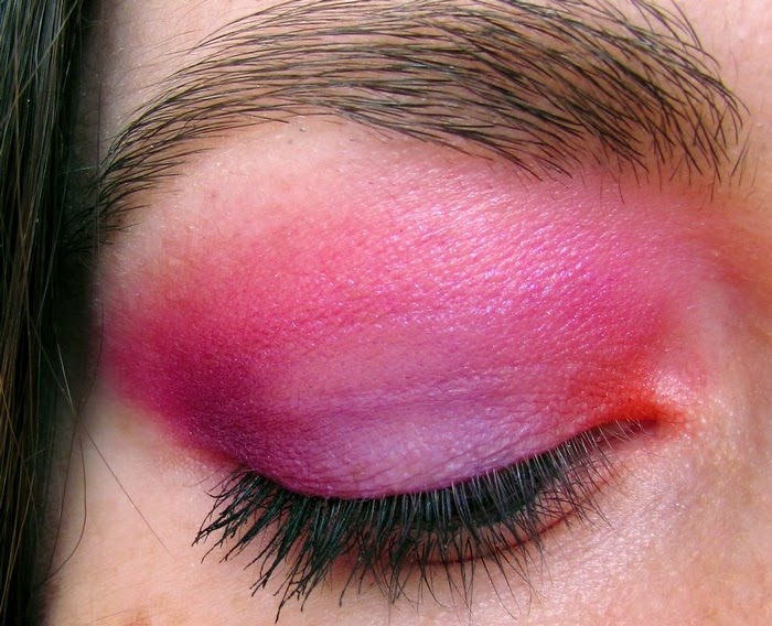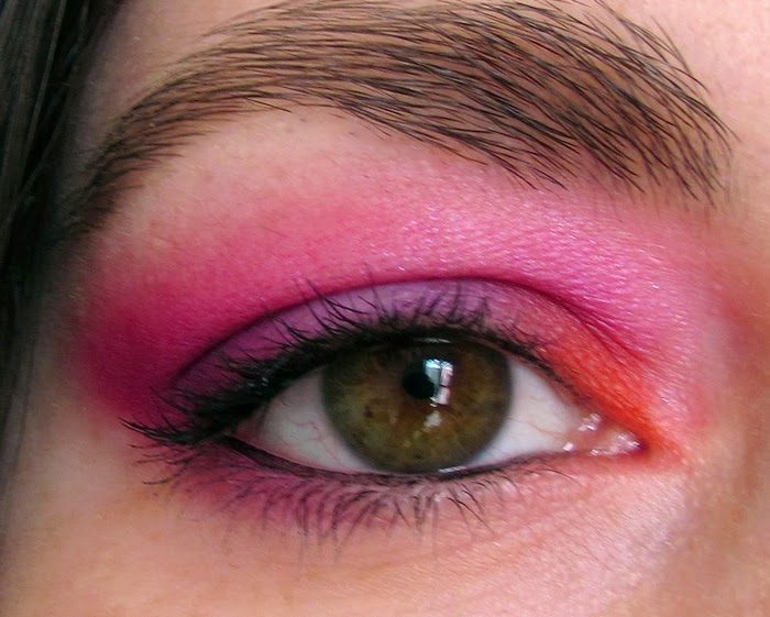 Ho utilizzato 3 dei colori del primo "riquadro" a sinistra della foto: il fuxia più caldo nella piega, l'arancio nell'angolo interno dell'occhio e il viola nella V esterna.
