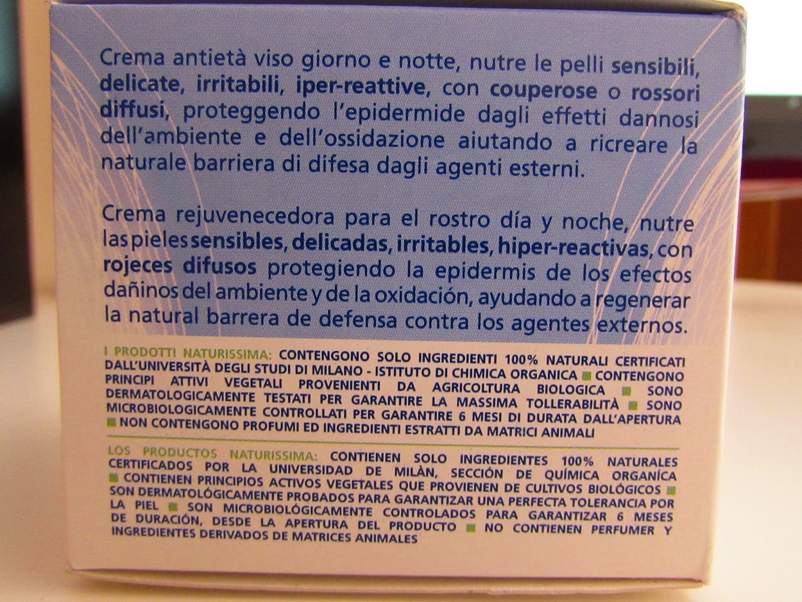 Questa crema (come tutti i prodotti Naturissima) contiene esclusivamente ingredienti naturali certificati dal dipartimento di chimica organica dell'Università di Milano.