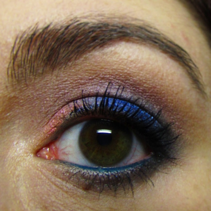 Ho utilizzato tonalità diverse,come il blu elettrico al centro dell palpebra mobile, il rosa corallo nella zona più interna, il viola nella piega e il verde ottanio nella rima ciliare inferiore.