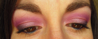 Ho usato il rosa più chiaro sulla palpebra mobile, il blu notte perlato all'esterno e il viola caldo opaco nella piega (che faticaccia! di questo servono 30 passate...)