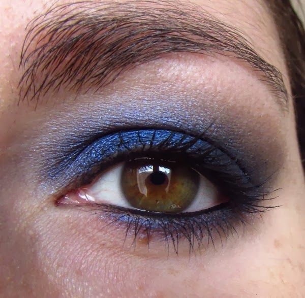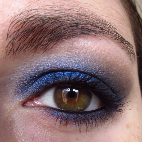 Potete infatti notare dalle foto come la tonalità vari da un blu elettrico acceso (quando è su base nera, appunto) a un blu-grigiastro quando invece è sfumato nella piega dell'occhio in cui la base non è presente.