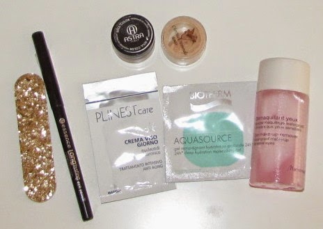 Nella parte inferiore della foto, da sinistra, troviamo la lima per unghie scintillissima che ho trovato in un set di smalti di Marionnaud, la long lasting lip pencil nera di essence che è automatica, quindi non ho bisogno di portarmi dietro un temperino, due campioncini di crema viso da giorno, una di Plinest care e l'altra di Biotherm e infine il mio struccante bifasico spignattato messo in una confezione vuota da 50 ml.